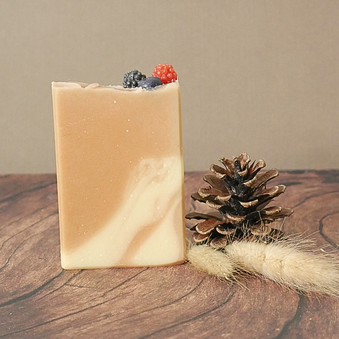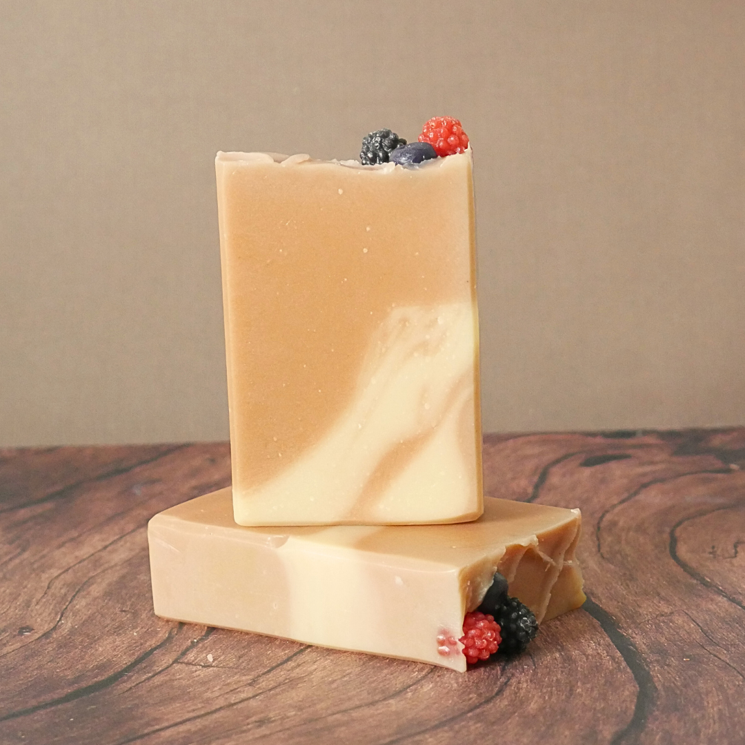 Oryza Sativa Bran Oil (Rice Bran), Olea Europaea Oil (Olive), Aqua, Sodium Hydroxide, Theobroma Cacao Seed Butter (Cocoa), Cocos Nucifera Oil (Coconut), Butyrospermum Parkii Fruit Butter (Shea), Goat Milk Powder, *Fragrance, Ricinus Communis Seed Oil (Castor), Stearic Acid, Kaolin Clay, *Mica
