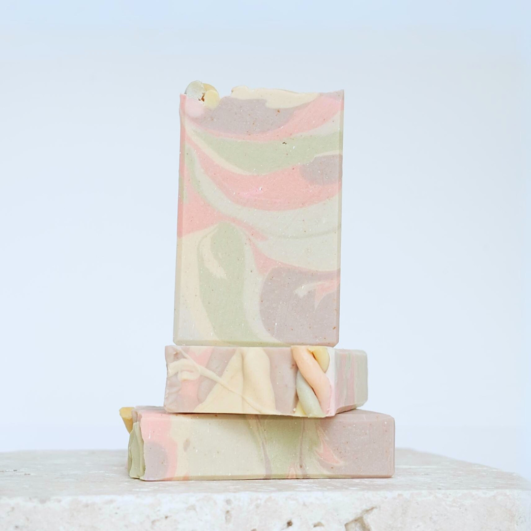 Oryza Sativa Bran Oil (Rice Bran), Olea Europaea Oil (Olive), Aqua, Sodium Hydroxide, Theobroma Cacao Seed Butter (Cocoa), Cocos Nucifera Oil (Coconut), Butyrospermum Parkii Fruit Butter (Shea), Goat Milk Powder, *Fragrance, Ricinus Communis Seed Oil (Castor), Stearic Acid, Kaolin Clay, *Mica